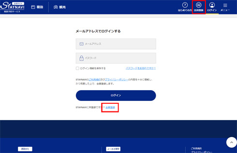 画面内の「ログイン」ボタン下にある、 「STAYNAVI(ステイナビ)に未登録ですか?会員登録」の「会員登録」、 もしくは、画面右上の「会員登録」ボタンをクリックします。